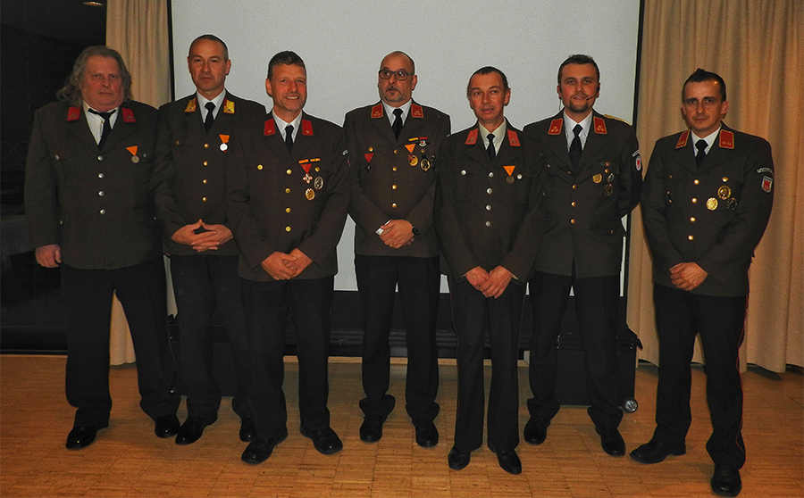 Die Feierlichkeit bot überdies einen würdigen Rahmen für die Ehrung verdienter Mitglieder. So wurde Johannes Allgäuer für 25 Jahre Zugehörigkeit sowie Hubert Bonner und Reinhard Fehr für 40 Jahre Zugehörigkeit mit der Feuerwehrmedaille in Bronze bzw. Silber gewürdigt. Für langjährige Kommandofunktionen und Verdienste um das Feuerwehrwesen wurde Thomas Matt mit dem Verdienstkreuz des Landes in Bronze und Edgar Giesinger mit dem Verdienstzeichen des Österreichischen Bundesfeuerwehrverbandes in der Stufe 3 ausgezeichnet. Giesinger erhielt für seine zurückliegende, zwölfjährige Tätigkeit als Kommandant zudem die Ehrenmitgliedschaft der OF Feldkirch-Stadt verliehen.